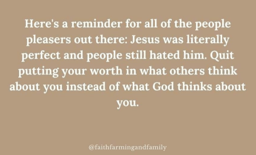 My meme: “Here’s a reminder for all of the people pleasers out there: Jesus was literally perfect and people still hated him. Quit putting your worth in what others think about you instead of what God thinks about you.” –@faithfarmingandfamily