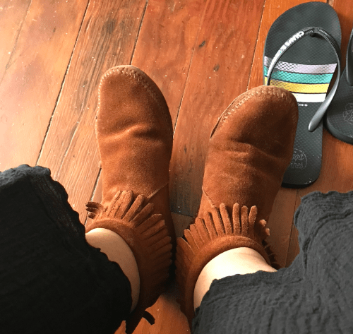 My grandmother and great grandmother wore moccasins, and this is my way of honoring them. I even hiked in Sedona, AZ wearing these (back in 2016), and pebbles hurt! Ouch! Uh, huh. How the heck did Native Americans only wear these things (and walk for hundreds of miles)? (I have had mine resoled with leather after I wore out the original suede bottoms.)
