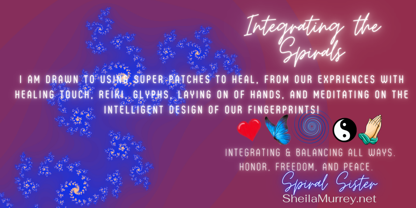 My meme: “I am drawn to using Super Patches to heal, from our experiences with Healing Touch, Reiki, Glyphs, Laying on of Hands, and meditation on the Intelligent Design of our fingerprints!” –Sheila Murrey