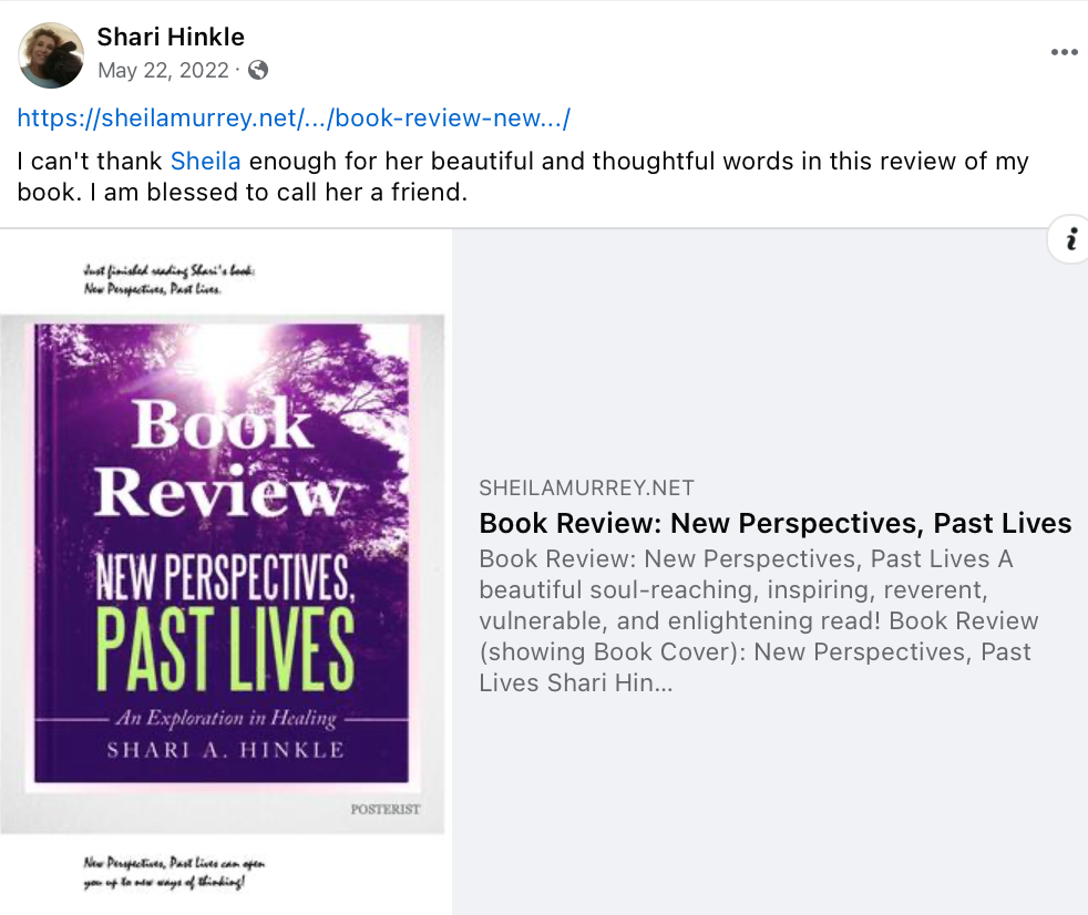 Screen capture of Shari sharing my review of her book, on Facebook! Here’s the link to my post and how you can get her book: https://sheilamurrey.net/2022/05/22/book-review-new-perspectives-past-lives/