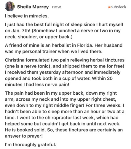 I’m starting to feel a little better too, thanks to some wonderful nerve tinctures a soulie-sister friend formulated for me and shipped to me from Florida. I can’t thank her enough! If she’s going to sell them on her website I’ll write a separate article on that with a link. I hope she will sell them because WOW! It was sure an answer to prayer for me! And I know my son and at least a couple friends will want to give these a try. Here’s the brief note I wrote on Substack about the tinctures: