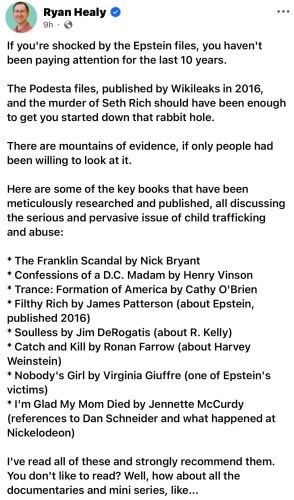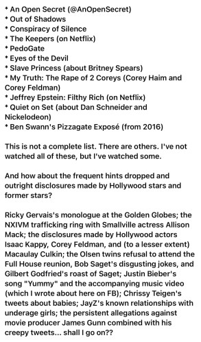 And then I see lists like this one from another Facebook Story that shows the names of movies and documentaries on the Epstein subject: