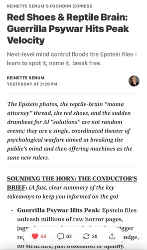 Reinette Senum. Reinette is a “former 2x mayor, CA gubernatorial candidate, and dedicated solutionarian.” –per her Substack bio. Reinette shares stories, hypotheses, personal commentary, cutting edge interviews, and “possibilities beyond the fog” on her Substack site called, Foghorn Express. Here’s a screen capture of one of her latest posts regarding Epstein: https://reinettesenumsfoghornexpress.substack.com/p/red-shoes-and-reptile-brain-guerrilla