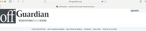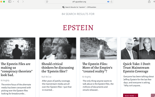 This first site that offers us a lot of investigative reports, Off Guardian, is new to me. This site offers a search function (top right of the website) where you can enter a word, like I did in the following image, and bring up a ton of information: