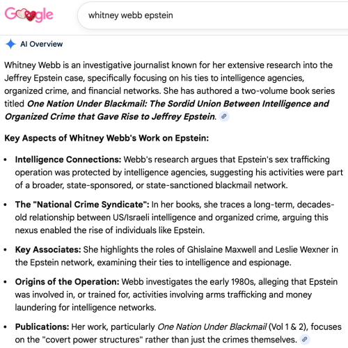 Of course, you always have the ability, if you take the time, to do a browser search on Epstein and anyone’s name to see what you might find. In the following example, I was curious how much Google would have to say regarding all the research Whitney Webb did on Epstein so I kept my search term broad. Here’s what it told me in the summary: