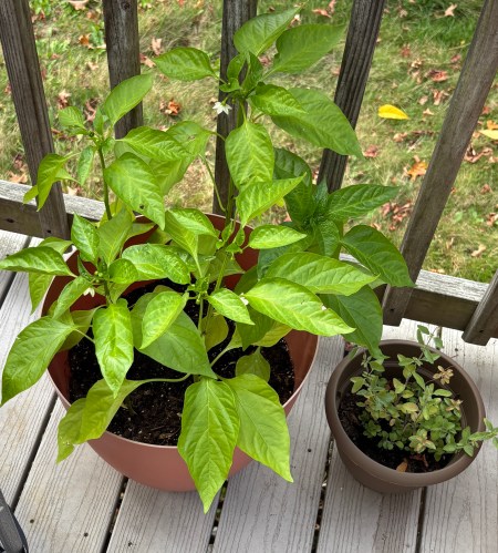 These are all the herbs I repotted. This is how they looked on their last day outside (Oct. 8th, 2025). I’ll compare them to this picture in the spring when I bring them back outside after the winter is done. I have three pots of basil, three of parsley, two of oregano, and one of dill. I don’t expect the dill to do much over the winter, but the little yellow flowers are supposed to turn into seeds I can replant in the spring. We’ll see!These are the plants that will stay outside all winter. Basil, Lavender, Peppermint, and oregano. I will figure out some better stands next spring to make this look prettier. But the plastic tub and lids were “what I had” when we moved in and I spent my money on new pots instead of plant stands, etc.The big plant is actually five bell pepper plants that I started from seed in July. Yes, I started them too late in the season, so I didn’t expect they’d even do this good. They got to the flowering stage a couple. of weeks before it got cold. I expect by November it will be done. But we’ll see!