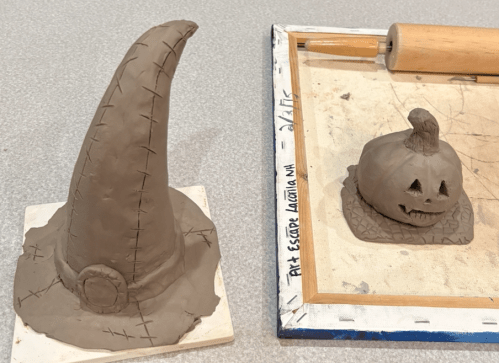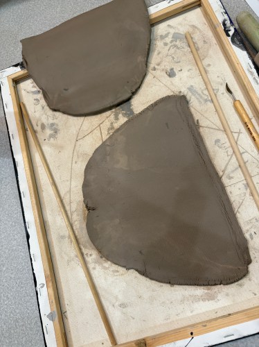 flattening out the clay. We worked on the back of an art canvas to keep the table clean. And we used dowel rods to ensure we got the clay as thin as possible. My two ghosts. This was how I left them at the studio before the first kiln firing.