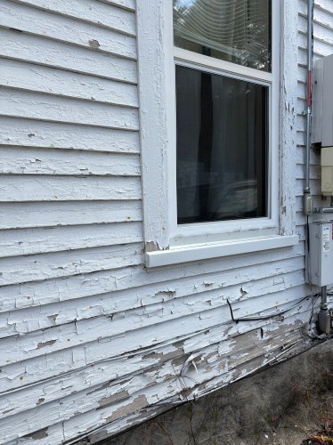 The side that gets beat on by weather the most. The sun porch gets the worst of it. There’s some wood that needs replaced under the windows. The window to the far left is in our apartment (and it’s behind the head of my bed).This is the worst of the wood that needs replaced.Close up of peeling paint. It’s been ten years since it has been painted. My son-in-law would like to fix the wood and paint it so he doesn’t lose the architectural details, but my daughter would like to put siding on the house so they don’t have to paint it again.This is the back side of the house, which is our apartment. Thankfully, we have this back door and deck because we use it a lot. I’d like to clean up the landscaping around the deck and have more lavender and such growing there, but I am simply not that fit to be out there digging up weeds, cleaning out what’s under the deck, placing pavers or rocks, etc. I can envision it, but will need someone else to do the manual labor.