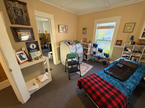 I got all the plants repotted and moved indoors (by the window) last week. The door to the left goes into Richard’s music room. The silver tent is my Relax sauna. I love it! It’s the best thing I’ve bought for this room and my health! I moved all of my medicinal tinctures and supplements to the bookshelves too, so anytime I need a boost or am feeling unwell, I have everything I need right next to the sauna. After I get out of the sauna I can rest by laying down on the red light pad with its nine PEMF settings. I moved my Therasage 7-modality heating pad upstairs to the lounge chair too, because I got us something for Christmas (it’s already here but I haven’t opened the box yet) that we’ll use downstairs (and it will provide us with MORE red light therapy)!