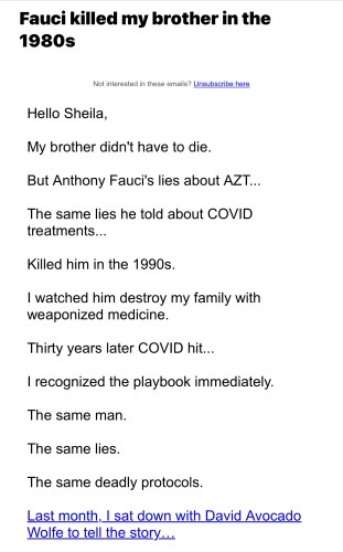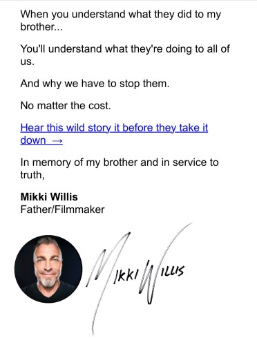 I didn’t know Mikki Willis had a gay brother. Or that his brother died after taking AZT. And that his mom died shortly after his brother because she was wracked with guilt and grief over the way he died (and choices she made to encourage him to take the medicine) because she “followed the science.”