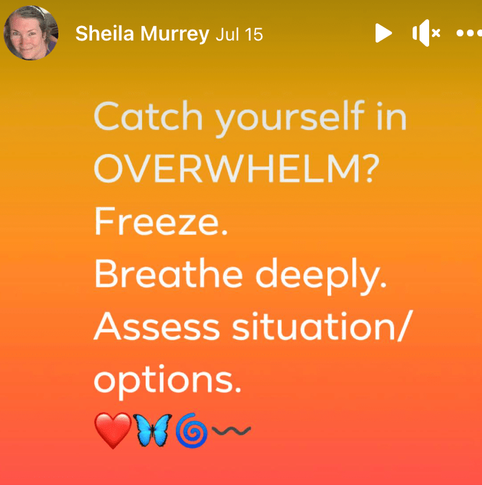 Catch yourself in overwhelm? Freeze. Breathe deeply. Assess the situation and check your options. You always (in myriad ALL ways) have a CHOICE.