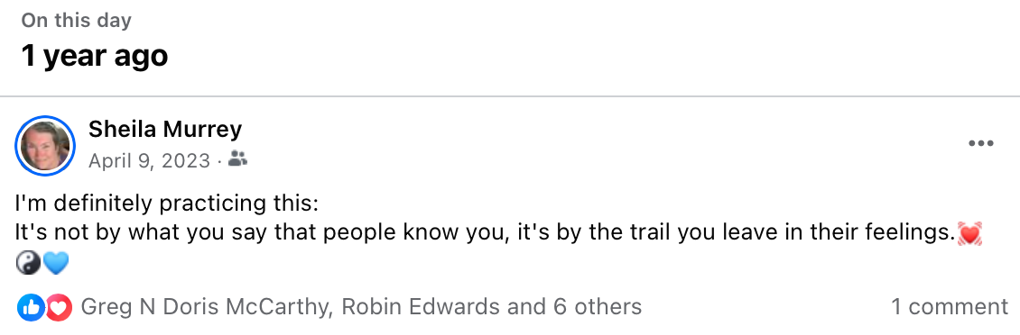 We can only control our thoughts and actions and hope to leave people feeling better about our interaction–we can’t control how others feel. I can’t control how trees bloom, but I can nurture the ground they grow in and prune them at the right time.