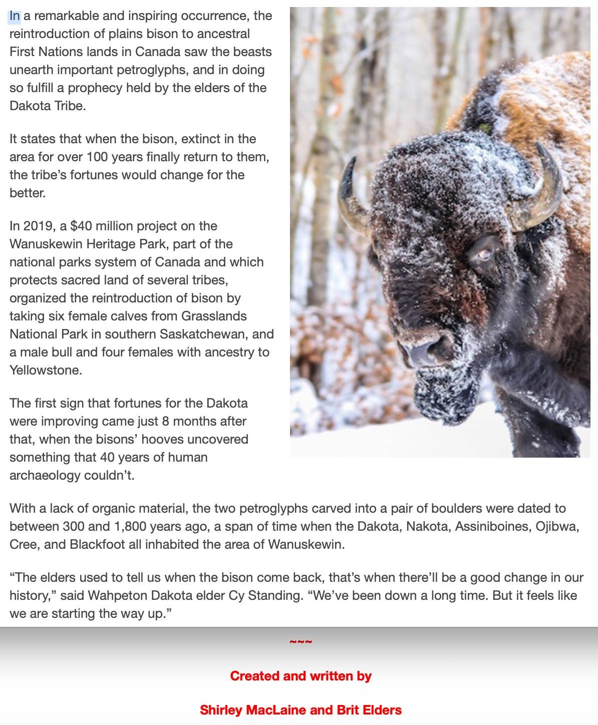 Screen capture: Story of the bison returning by Shirley MacLaine and Brit Elders via Shirley’s monthly email letter I subscribe to.