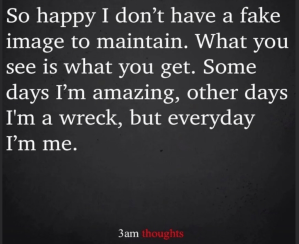 So probably also I saw a Facebook meme the other day, which I shared as well, that talked about I’m this real person and that I don’t have to put a fake face on to face the world. I don’t have to pretend to be something that I’m not and some days I am amazing. And some days I’m a wreck. It was that kind of a meme. Those of you who follow me here and also follow me on Facebook, you’ve got that already. You’ve seen it.