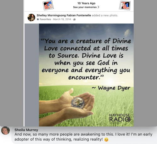 Screen capture: A Facebook post from 10 years ago with my comment. “And now, so many more people are awakening to this. I love it! I am an early adopter of this way of thinking, realizing reality!” –Sheila Murrey
