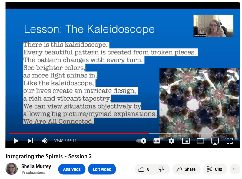 So I definitely think it’s in the zeitgeist. I think a tool we played with as a child, we put it down. Most never picked it up again. I never did until my eldest granddaughter asked me when she was very young for a kaleidoscope. I had forgotten all about it too. But now I’m using it in the sessions that I have with Integrating the Spirals. And I’ve got to tell you that it’s so profound and powerful this work because we all have some sort of like at the bottom of all of our fears and phobias and anxieties and distrust and doubts and negative self-talk and all of that is always like this feeling of unworthiness or being broken.