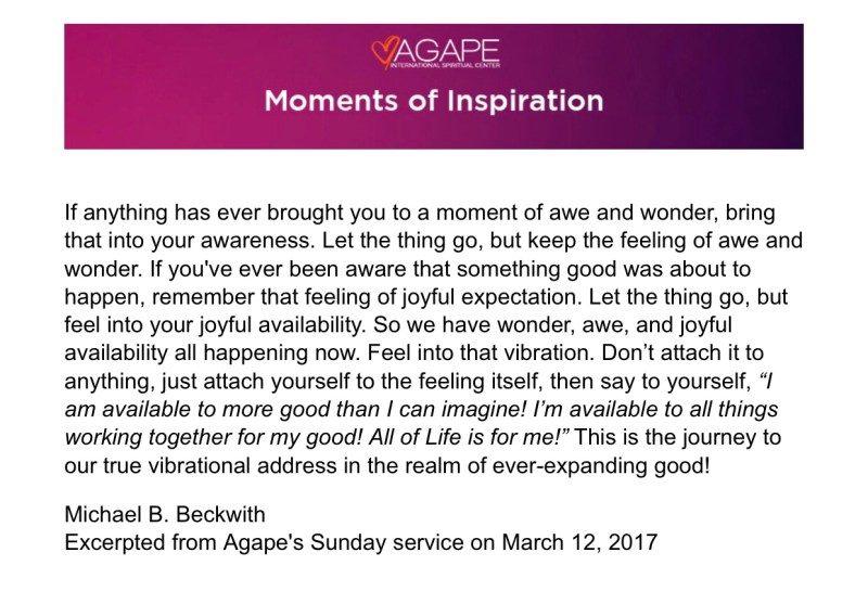 I love to meditate on mantras or quotes until I observe thoughts slowing down. Primarily, I meditate on downloads I receive from the Holy Spirit/Ghost, Great Spirit, Creator, Source, or from my higher self, and many from Silver Birch (you have seen I have shared many of his posts before). Then there are quotes from TUT, prayers from various cultures curated by Nick Polizzi (of The Sacred Science), and quotes from most beloved teacher, Dr. Rev. Michael Bernard Beckwith. Thus, I thought I’d share several favorites now with more to follow in the weeks ahead. I suppose reading all of these strung together—it could be a sermon!