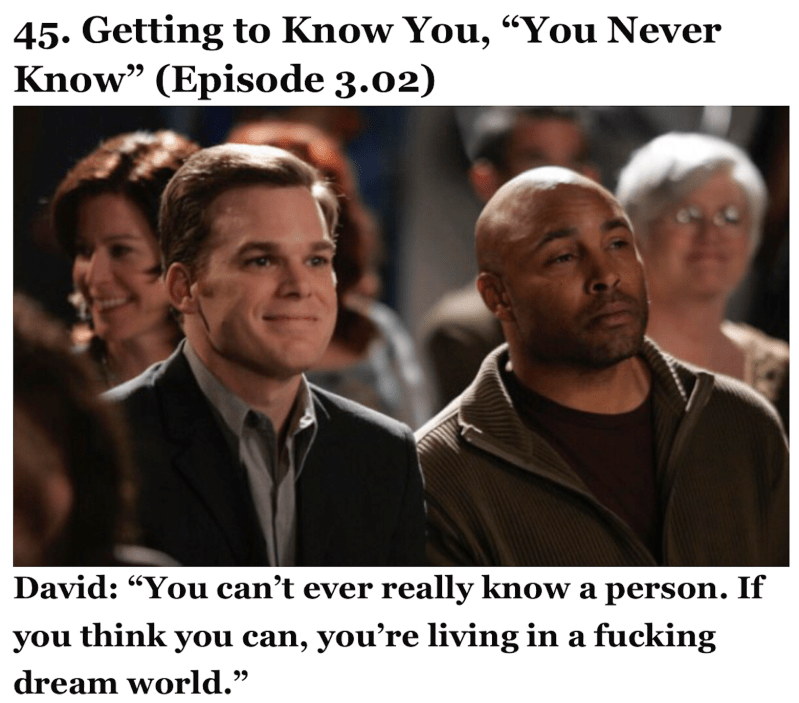 One of my favorite TV quotes: “You can’t ever really know a person. If you think you can, you’re living in a f’n dream world.” –Six Feet Under