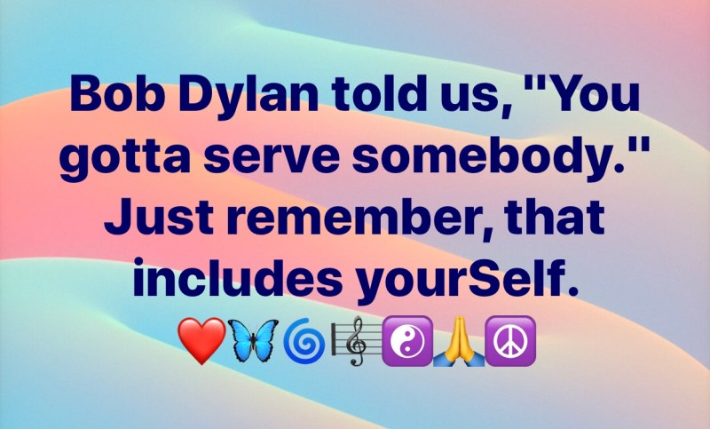 I know in order for me to make the commitment to a healthy, whole, and vibrant body means I must be held accountable. By serving others, I will serve myself. And in Bob Dylan’s famous words, “You gotta serve somebody.”