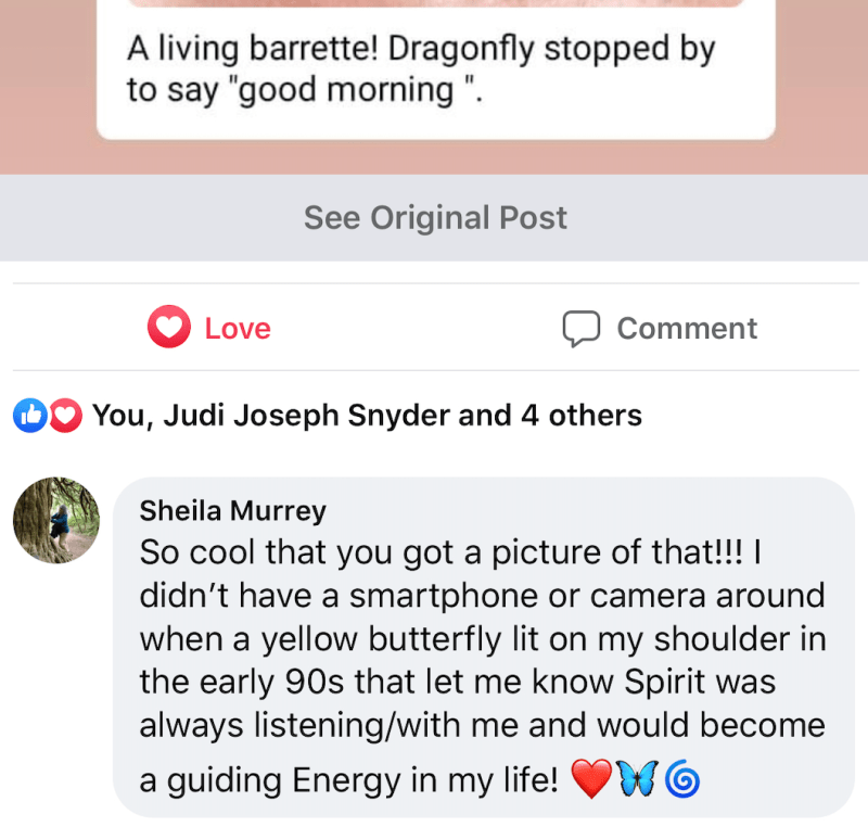 Here’s a screen shot of a comment I wrote my friend, Shari, when she’d posted a picture on Facebook of the time a dragonfly, or living barrette, decided to sit atop her head.