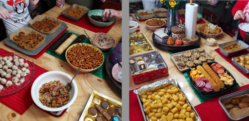 The bourbon balls I made are bottom left, and fruit cake soaked in Irish whisky is next to that in the white bowl. The holiday bacon is harder to see, it’s in my teal painted stoneware bowl in the left picture top right corner, and I love that my son-in-law’s hand is in the photo! Ha! Our eldest granddaughter is wearing the ‘let it snow’ t-shirt. We also contributed a tin of fancy cookies from Europe. My daughter, Marie, made a delicious spinach dip in a bread bowl and son-in-law made the chocolate chip cookies. YUM! We had mini corn dogs (I’d never had those before, tater tots, and lots of meat, cheese, and crackers. Marie put this whole spread together–she’s an amazing organizer! –Photos from Marie Lemire.