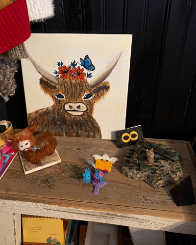 Photo: My bedside table displaying hairy coo painting and ceramic figurine – plus crystals and handmade flowers from the twins. A few of you will see things you recognize here, daily calendar from my ‘Sis’ Doris, shungite pyramid from Sherinata, ocean jasper and dragon lace agate from Stacy Royal, and infinity ‘8’ card from Debra. Sooo many people and places to remember and hold in gratitude. –Sheila Murrey