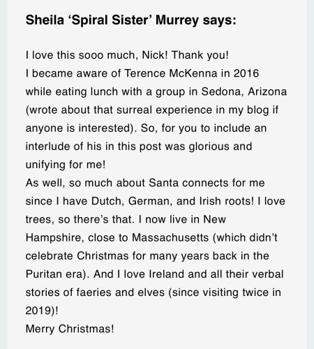 Screen capture: Do you see how I talk about you when you’re not here? Haha! This was my comment to Nick of The Sacred Science, on his recent blog post, https://www.thesacredscience.com/is-santa-a-shamanic-sun-god/?utm_source=Klaviyo&utm_medium=campaign&_kx=dVoZGL-MIGkqZ_IS2-9H6cfsMR0krYCjuWn_6IpUv4g.WzyybV. I should have shared it yesterday since I mentioned elves.