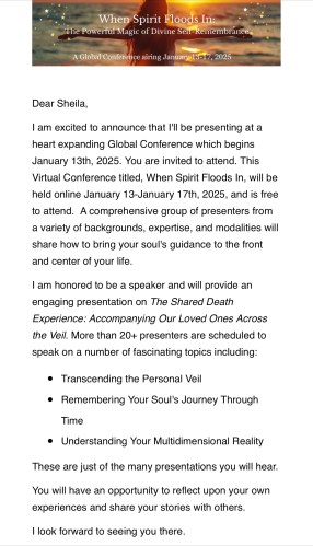 January 13th, 2025 virtual global conference on The Shared Death Experience: Accompanying Our Loved Ones Across The Veil. Here’s how to sign up (register) to join: https://www.when-spirit-floods-in.com