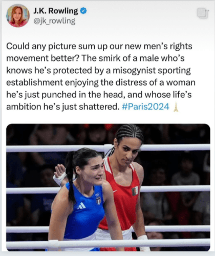 Regarding the Olympics boxing matter, Dr. Sheri Tenpenny and others have offered additional information on the subject that has helped bring me back into balance. I have sat with the subject for a few days and have found more compassion within for both of the boxers discussed in the following news story. I like 1440 news and now, Tangle. They both offer ‘just the news’ without the biased reporting. While J.K. Rowling’s post triggered me, The Tangle news article offered me more reason to summon compassion for the bio male who was labeled a female at birth (whether by mistake or not), or suffers from an over abundance of the male hormone testosterone.