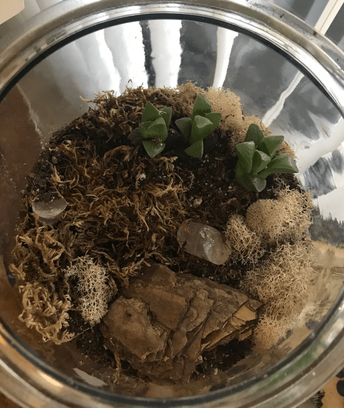 I dropped one of my rose quartz crystals the other day, so I added a couple pieces of it to the terrarium too. The moss was brown right off the start, so the only green in there is the succulent.