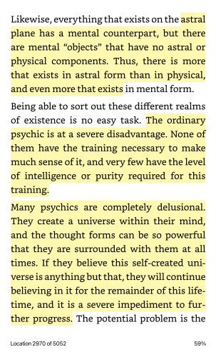 Screen capture: Ancient Wisdom for a New Age: A Practical Guide for Spiritual GrowthScreen capture: “Many psychics are completely delusional. The create a universe within their mind, and the thought forms can be so powerful that they are surrounded with them at all times. If they believe this self-created universe is anything but that, they will continue believing in it for the remainder of this lifetime, and it is a severe impediment to further (spiritual) progress.” –Ancient Wisdom