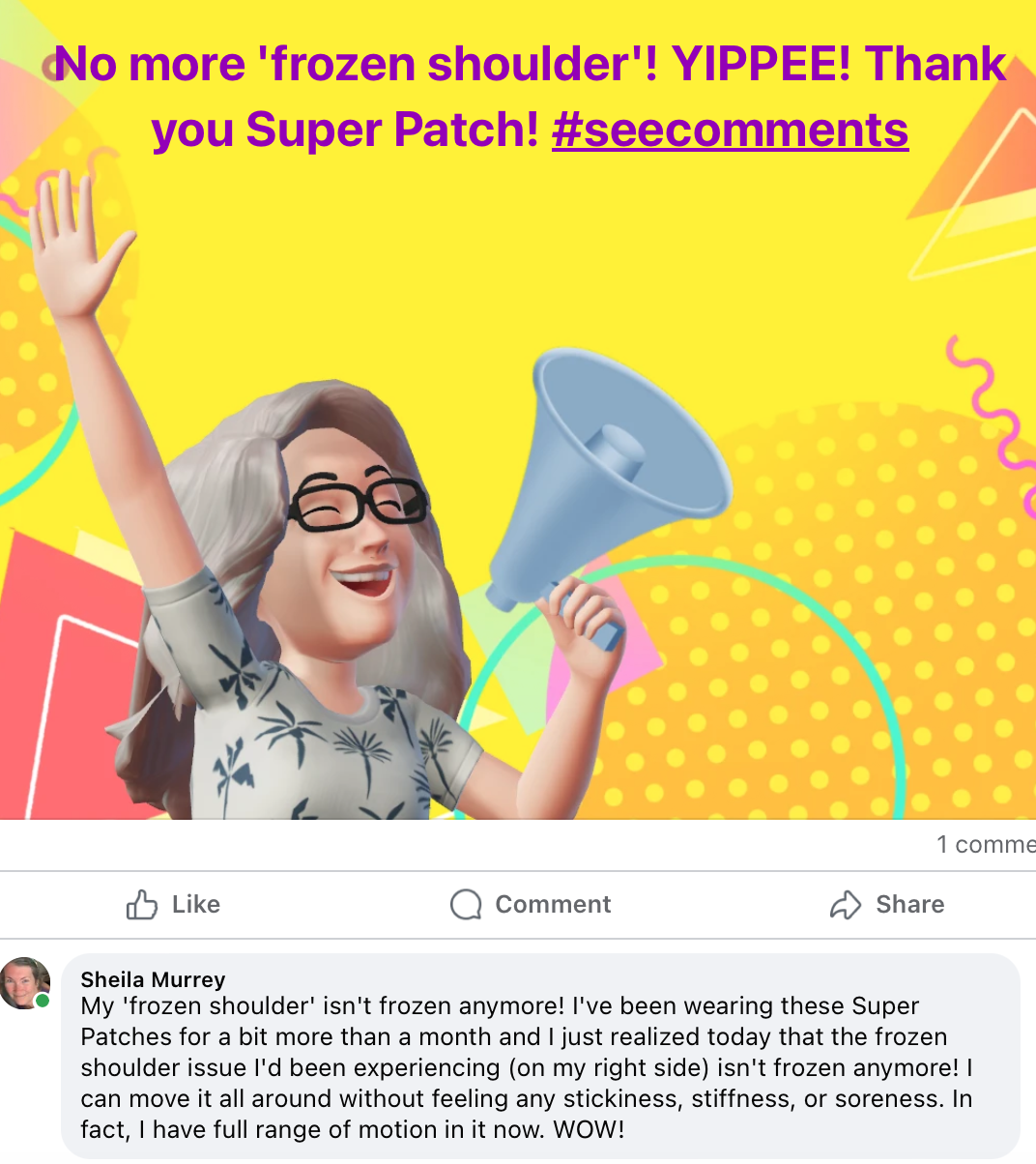 My Facebook post regarding the frozen shoulder I’d experienced for over a year and how it’s cleared up now, by wearing 3 or 4 different Super Patches each day, for the last month! –Sheila MurreyMy Facebook comment regarding which Super Patches I’ve been wearing for other reasons and then finding my frozen shoulder wasn’t frozen anymore (it only took a month)! –Sheila Murrey